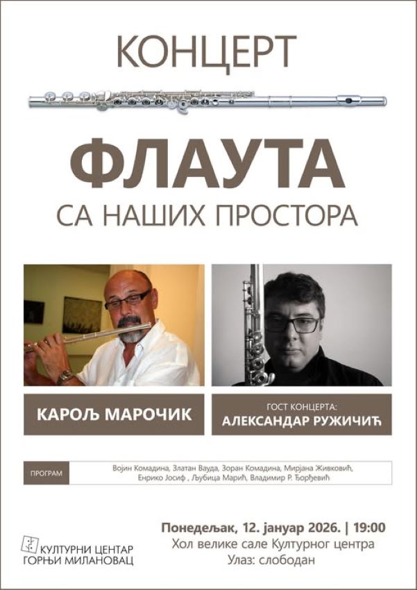 Kulturni centar “Mija Aleksić” organizuje u ponedeljak, 12. januara 2025. godine u holu ispred velike sale koncert Karolja Maročika naziva “Flauta sa naših prostora”.