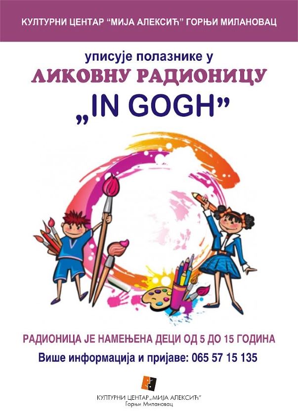 Kulturni centar “Mija Aleksić”, Gornji Milanovac, započeo je sa upisom polaznika u likovnu radionicu „In Gogh“. Radionica je namenjena deci uzrasta od 5 do 15 godina.