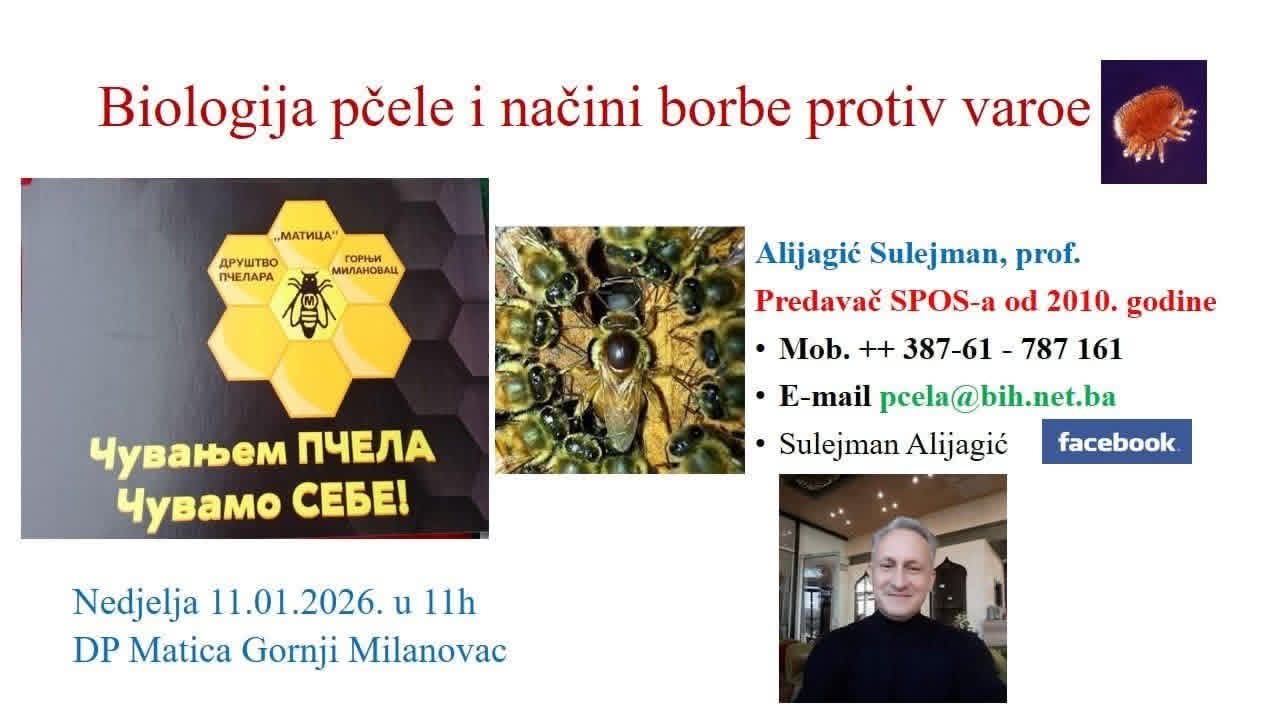 U organizaciji DP “Matica” u nedelju, 11. januara 2026. godine, sa početkom u 11 časova, u velikoj sali Opštine Gornji Milanovac biće održano stručno predavanje na temu „Biologija pčele i način borbe protiv varoe“.