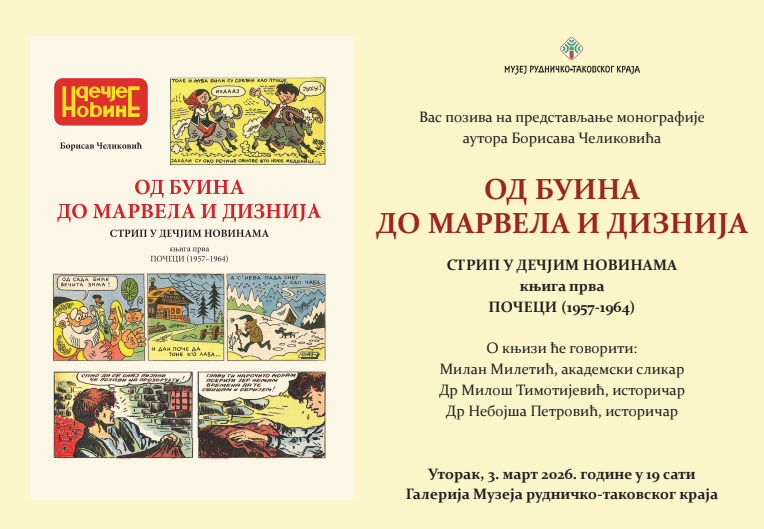 U autentičnom ambijentu izložbe ,, Strip u Dečjim novinama” u Galeriji Muzeja rudničko-takovskog kraja u utorak 3. marta 2026. godine u 19 časova će biti održana promocija monografije ,, Od Buina do Marvela i Diznija: strip u Dečjim novinama, knj. 1, Počeci (1957-1964)’’. Ova knjiga nastala je kao sastavni deo projekta koji je tokom 2025. godine sufinansiralo Ministarstvo kulture Republike Srbije. O značaju monografije koja kroz prizmu ,,Dečjih novina’’ prati razvoj stripa od lokalnih korena do globalne saradnje sa svetskim gigantima govoriće emintentni sagovornici: akademski slikar Milan Miletić, istoričari dr Miloš Timotijević i dr Nebojša Petrović, kao i autor monografije istoričar Borisav Čeliković.