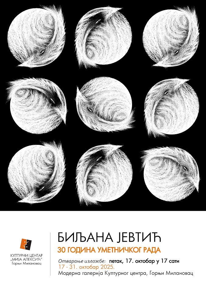 Biljana Jevtić, redovna profesorka na Akademije umetnosti Univerziteta u Novom Sadu (Katedra za Crtanje), povodom 30 godina umetničkog rada, u petak 17. oktobra 2025. godine u Modernoj galeriji Kulturnog centra predstaviće svoje stvaralaštvo.
