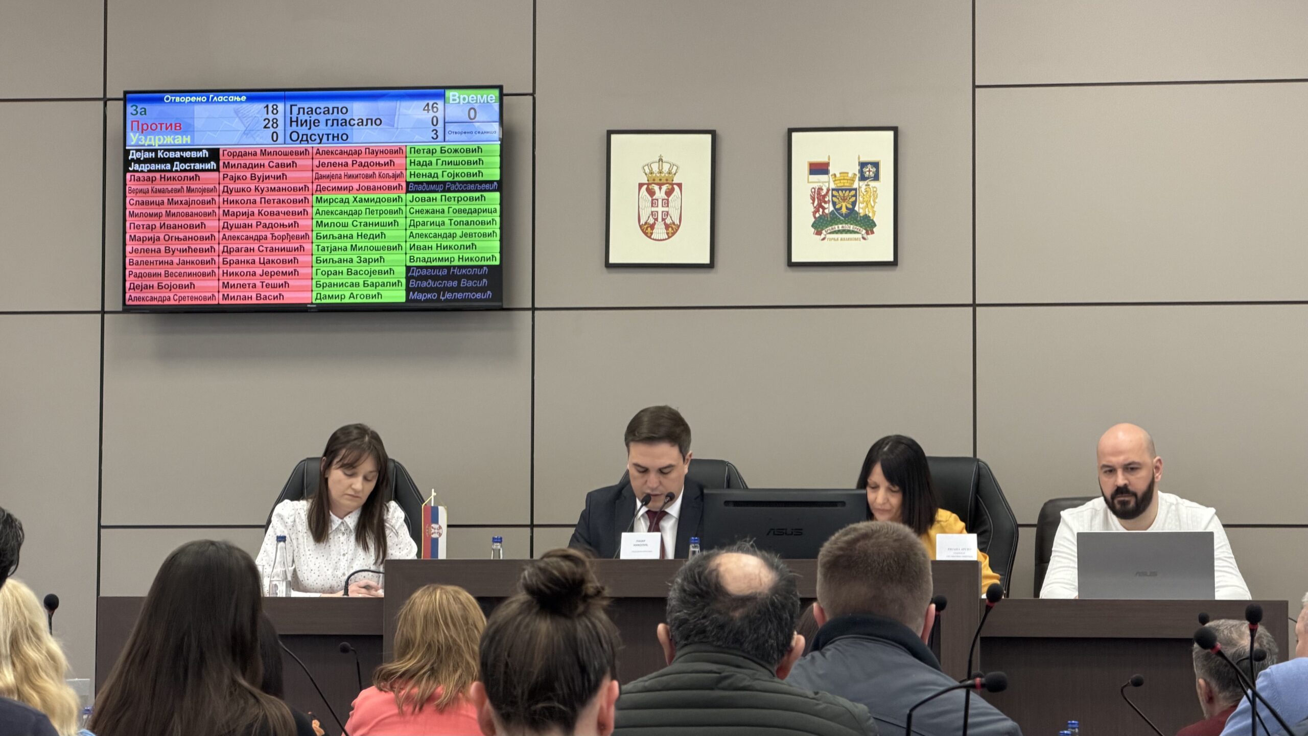 Današnjem zasedanju, pored Vladimira Radosavljevića, nisu prisustvovali ni odbornici Dragica Nikolić i Vladislav Vasić.