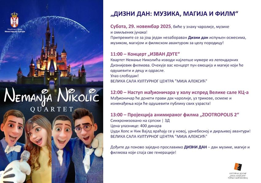 Za decu Gornjeg Milanovca i njihove roditelje, Kulturni centar “Mija Aleksić” orgunizuje u subotu, 29. novembra 2025. godine u Domu kulture Dizni dan posvećen muzici, magiji i filmu.