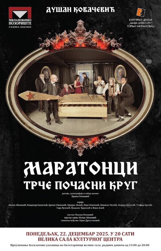 Posle uspešne mini-turneje Milanovačkog pozorišta po Sloveniji, sa predstavom “Maratonci trče počasni krug,” za koju se tražila karta više, komedija Dušana Kovačevića koju je na scenu postavio Branko Knežević u ponedeljak, 22. decembra 2025. godine ponovo će se naći pred gornjomilanovačkom publikom, ovoga puta biće izvedena na velikoj sceni Doma kulture. Predstava je dar Kulturnog centra “Mija Aleksić” građanima Gornjeg Milanovca povodom predstojećih praznika.