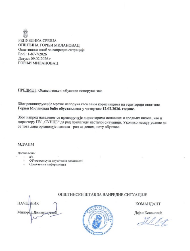 S obzirom na to da će u četvrtak, 12. februara 2026. godine JP „Srbijagas“ Novi Sad izvoditi radove na gasovodima u Moravičkom i Zlatiborskom okrugu, usled čega će doći do kratkotrajnog poremećaja u isporuci prirodnog gasa, u prilogu mejla vam dostavljam Preporuku Opštinskog štaba za vanredne situacije.