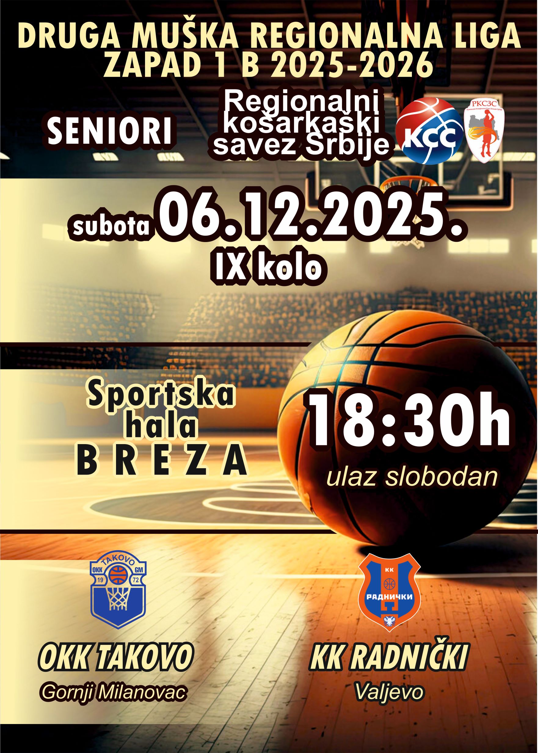 U sledećem IX kolu Takovo je domaćin ekipi Radničkog iz Valjeva. Utakmica se igra u hali BREZA u subotu 06.12.2025 godine sa početkom u 18 i 30.