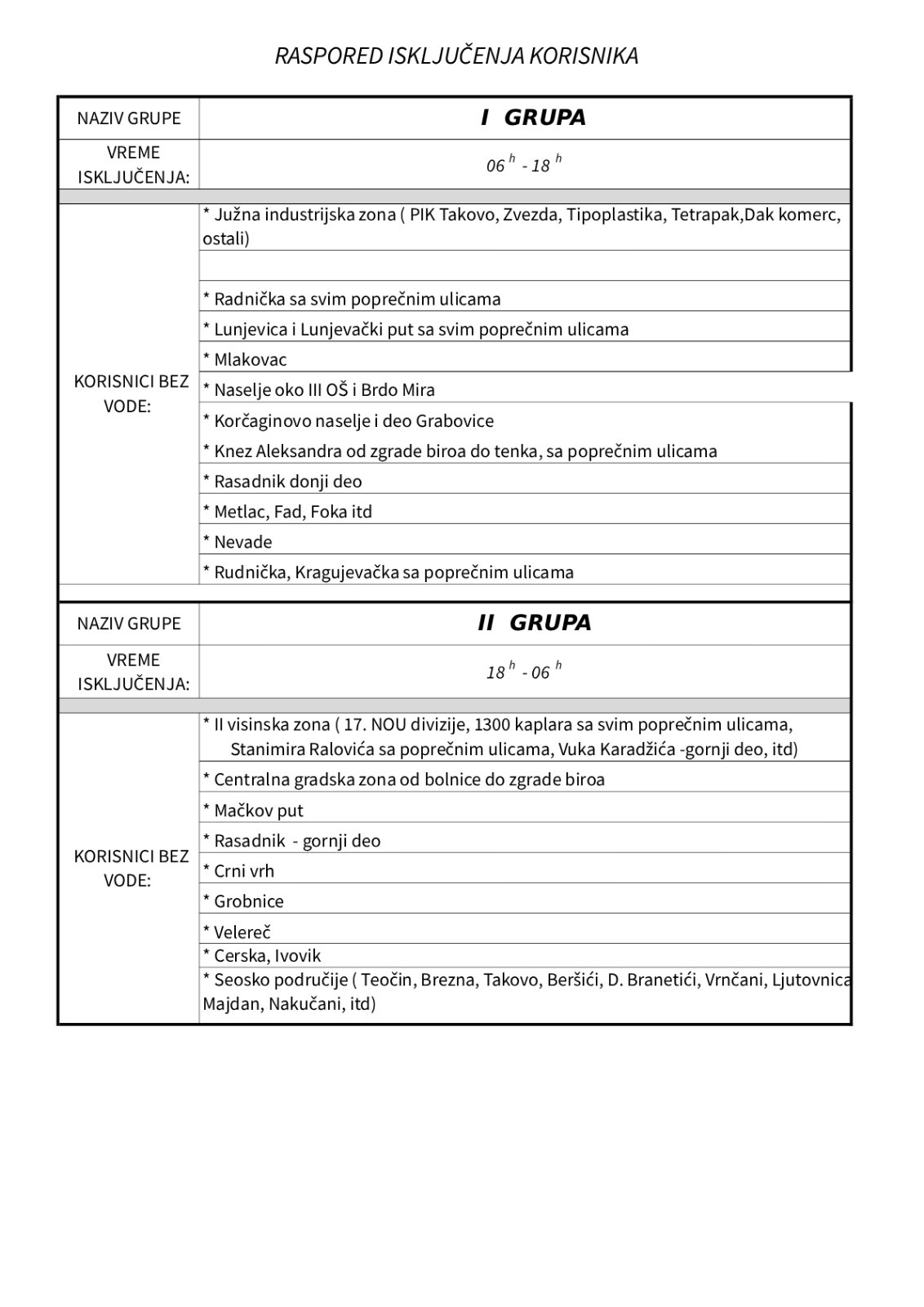U vezi sa tim od 15.08.2025. godine isporuka vode će se vršiti prema rasporedu u prilogu.
