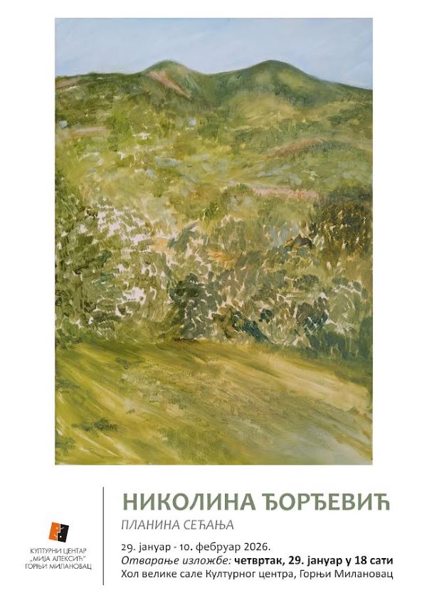 Nikolina Đorđević (2003, Gornji Milanovac), studentkinja Fakulteta primenjenih umetnosti Univerziteta umetnosti u Beogradu, Odsek za konzervaciju i restauraciju slika i umetničkih dela na papiru, predstaviće u četvrtak, 29. januara 2026. godine u Galeriji hola ispred velike sale Kulturnog centra izložbu radova naziva “Planina sećanja”