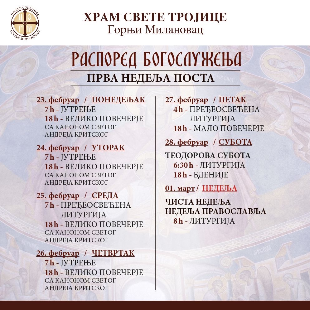 Početna/DRUŠTVO/Raspored Bogosluženja prve nedelje posta DRUŠTVOVESTI Raspored Bogosluženja prve nedelje posta gmpress 60 Dodato GM PRESS Tagbogosluženje gornji milanovac gmpress 60 Dodato Facebook Twitter LinkedIn Messenger Messenger WhatsApp Telegram Viber Prodelite putem e-mail