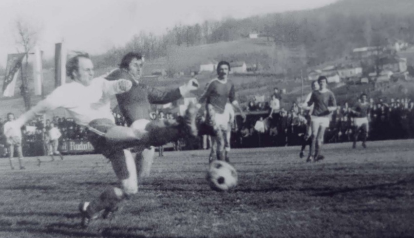 Radoljub Dimitrijević, bek “Takova” interveniše ispred Gžegoža Latoa, napadača reprezentacije Poljske (Gornji Milanovac, 1977. godina)
