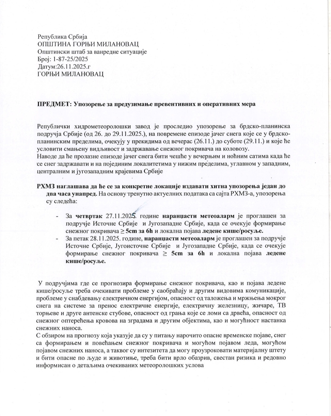 Republički hidrometeorološki zavod (RHZS) izdao je hitno upozorenje zbog snega, formiranja ledenog pokrivača i mogućih snežnih nanosa. Očekuje se da će visina snežnog pokrivača dostići 25 do 60 cm, a lokalno čak i 80 cm.