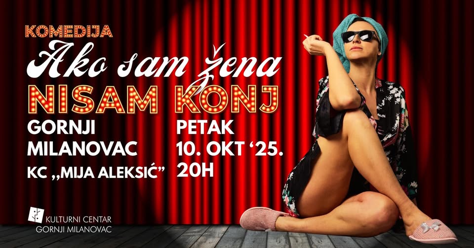 Na velikoj sceni Kulturnog centra “Mija Aleksić” u Gornjem Milanovcu u petak, 10. oktobra 2025. godine biće izvedena komedija „Ako sam žena nisam konj“, koju je na scenu postavio reditelj Jovan Ljubenović.